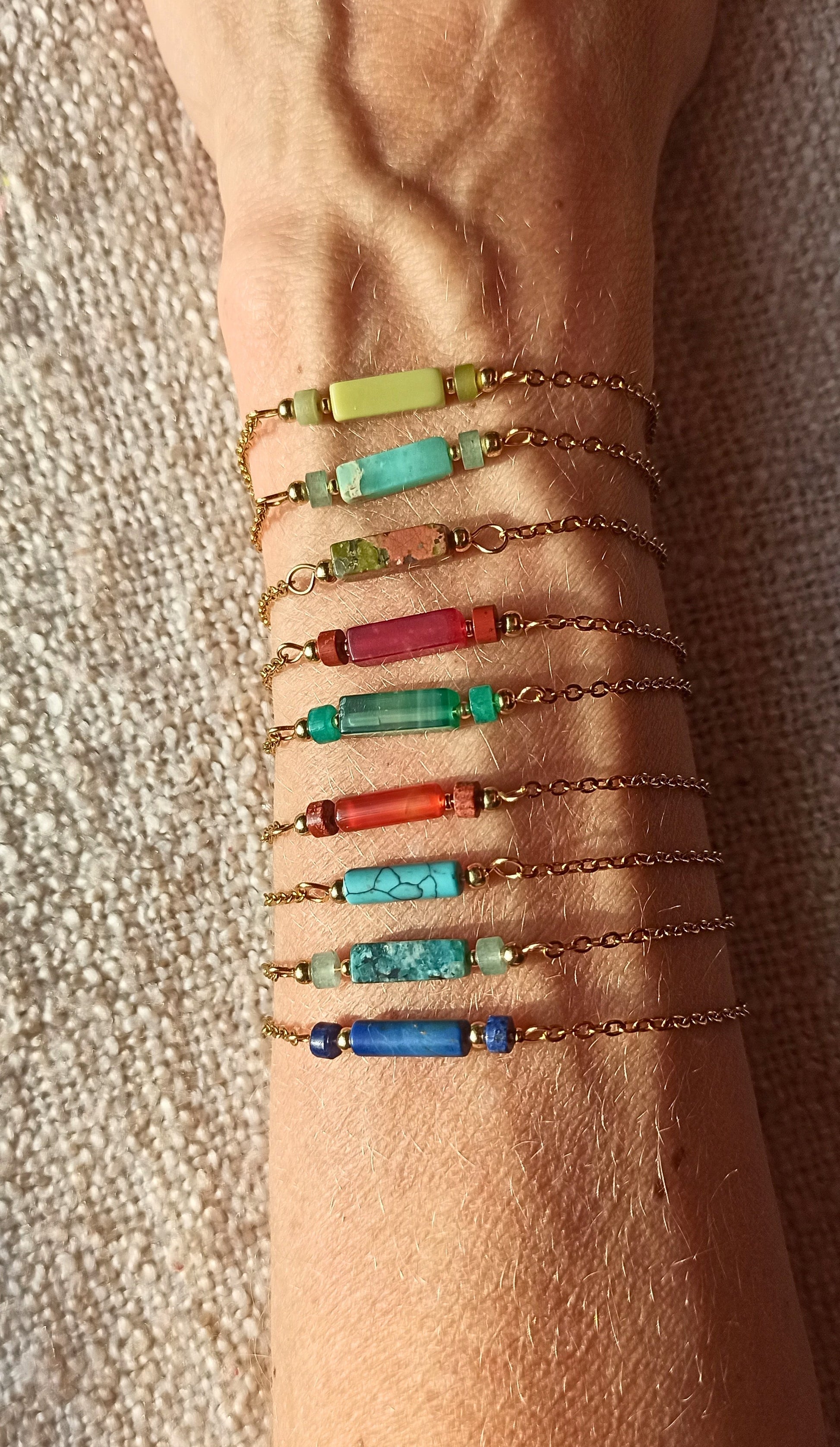Onze gold plated armbanden met verschillende edelsteentjes zijn kleine schatten om je pols. Elk steentje heeft zijn eigen kleur, energie en verhaal, samen gevangen in een verfijnde gouden glans. Perfect om solo te dragen of te combineren voor een speelse, persoonlijke look die elke outfit laat stralen.